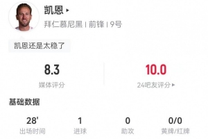 体育资讯1月29日讯 拜仁在本轮欧冠2-1力克埃因霍温,凯恩本场数据如下:
