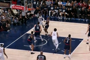 德里克·怀特扑防鲍威尔三分犯规疑似垫脚 裁判回看升级一级恶意