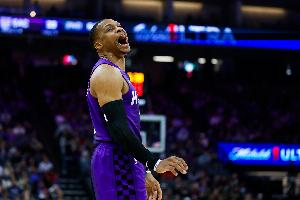 本场比赛,威少出战32分钟,投篮14中8,三分球10中5,罚球2中0,拿到21分5篮板9助攻。