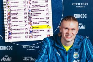哈兰德首次在安菲尔德进球,英超出战过的24个球场,他已攻破23个球场大门,只剩埃弗顿新球场——希尔·迪金森球场还未进球。