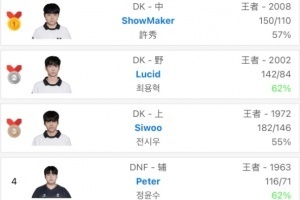 韩服排行榜更新:DK上中野包揽前三 Peter来到第四 Peyz来到第五啦!