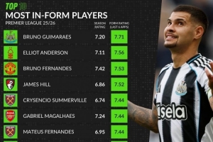 whoscored英超近期状态榜:近6轮平均分
