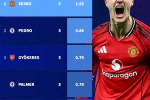 体育资讯2月24日讯 英超第27轮比赛,曼联在客场以1-0的比分小胜埃弗顿,舍什科打进全场唯一进球。进入2026年,斯洛文尼亚前锋已在英超中打进5球。