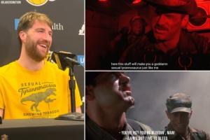 赛后,湖人球员德鲁·蒂米身穿一件写有“性感霸王龙(sexual tyrannosaurus)”字样的T恤接受采访。