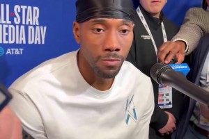 又帅了文!欧文现身全明星赛场 面对镜头开心比出专属手势